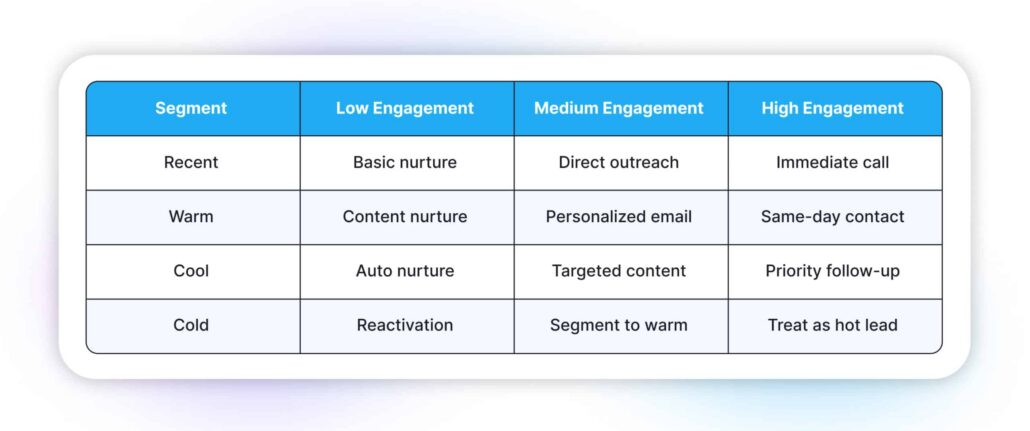 The power of effective real estate database segmentation comes from cross-referencing time and behavior. Here’s a simplified action matrix: